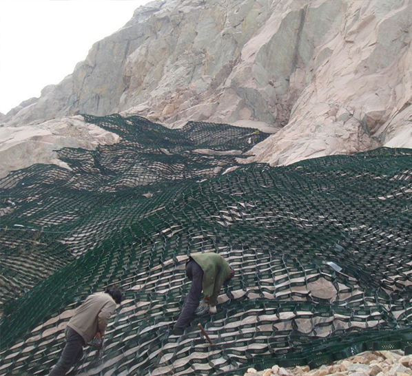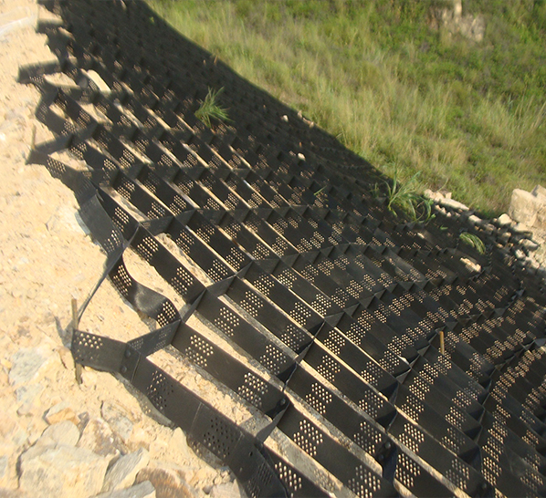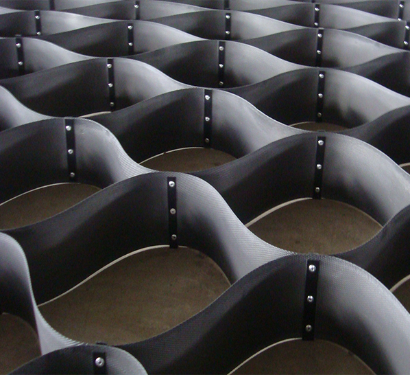 土工格室是由高強(qiáng)度的HDPE或PP共聚料寬帶,經(jīng)過(guò)強(qiáng)力焊接或鉚接而形成的一片網(wǎng)狀格室結(jié)構(gòu)。它伸縮自如,運(yùn)輸時(shí)可縮疊起來(lái),使用時(shí)張開(kāi)并又充填土石或混凝土料,構(gòu)成具有強(qiáng)大側(cè)向限制和大剛度的結(jié)構(gòu)體。它可用來(lái)做為墊層,處理軟弱地基增大地基的承載能力,也可鋪設(shè)在坡面上構(gòu)成坡面防護(hù)結(jié)構(gòu),還可以用來(lái)建造支擋結(jié)構(gòu)等。